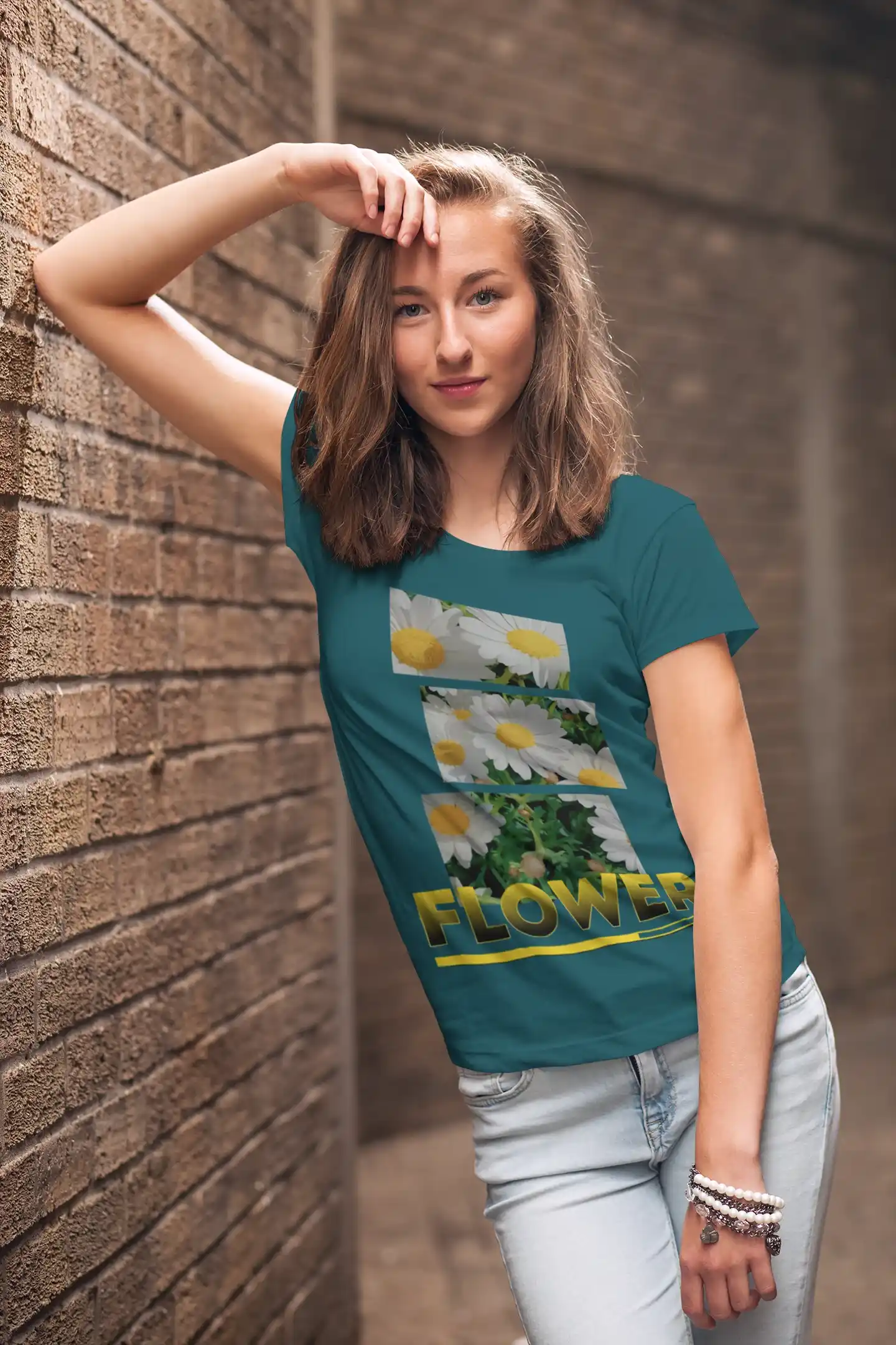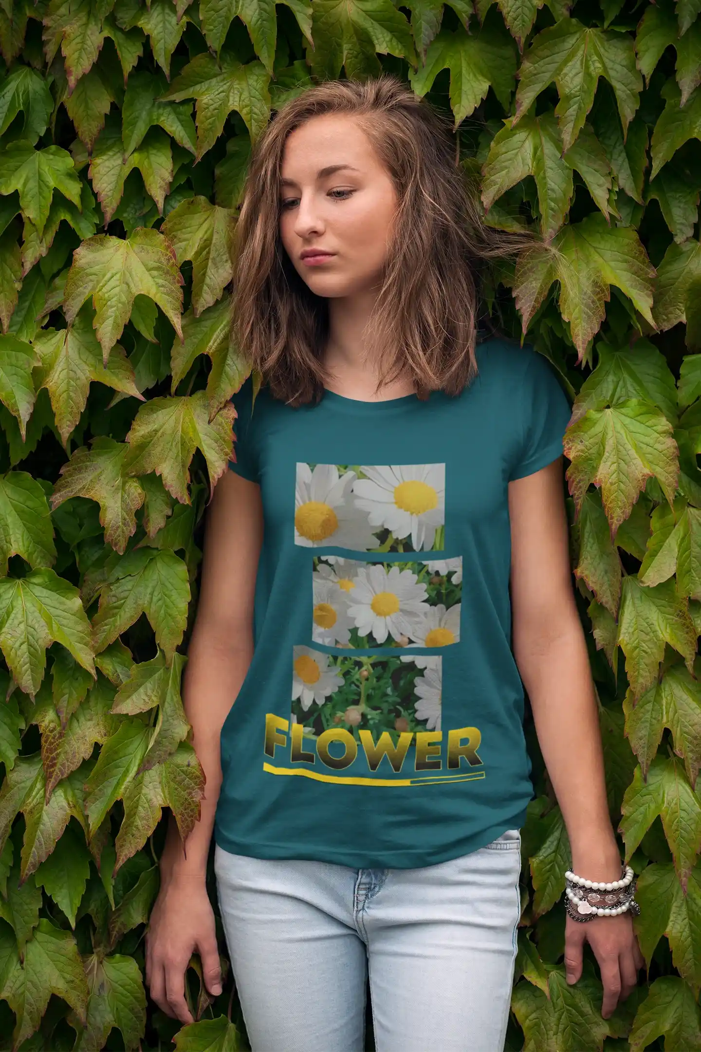 Lleva la belleza de un jardín contigo a donde vayas con nuestra exclusiva camiseta de "FLOWER". Esta prenda es un lienzo de estilo visual, con un diseño que presenta una composición de tres fotografías en formato vertical de delicadas margaritas. La audaz palabra "FLOWER" en tipografía dorada complementa la estética, creando una pieza de moda que es a la vez artística y moderna. Es la elección perfecta para quienes aprecian la moda con un toque de arte, un estilo minimalista y un mensaje de calma y sencillez.