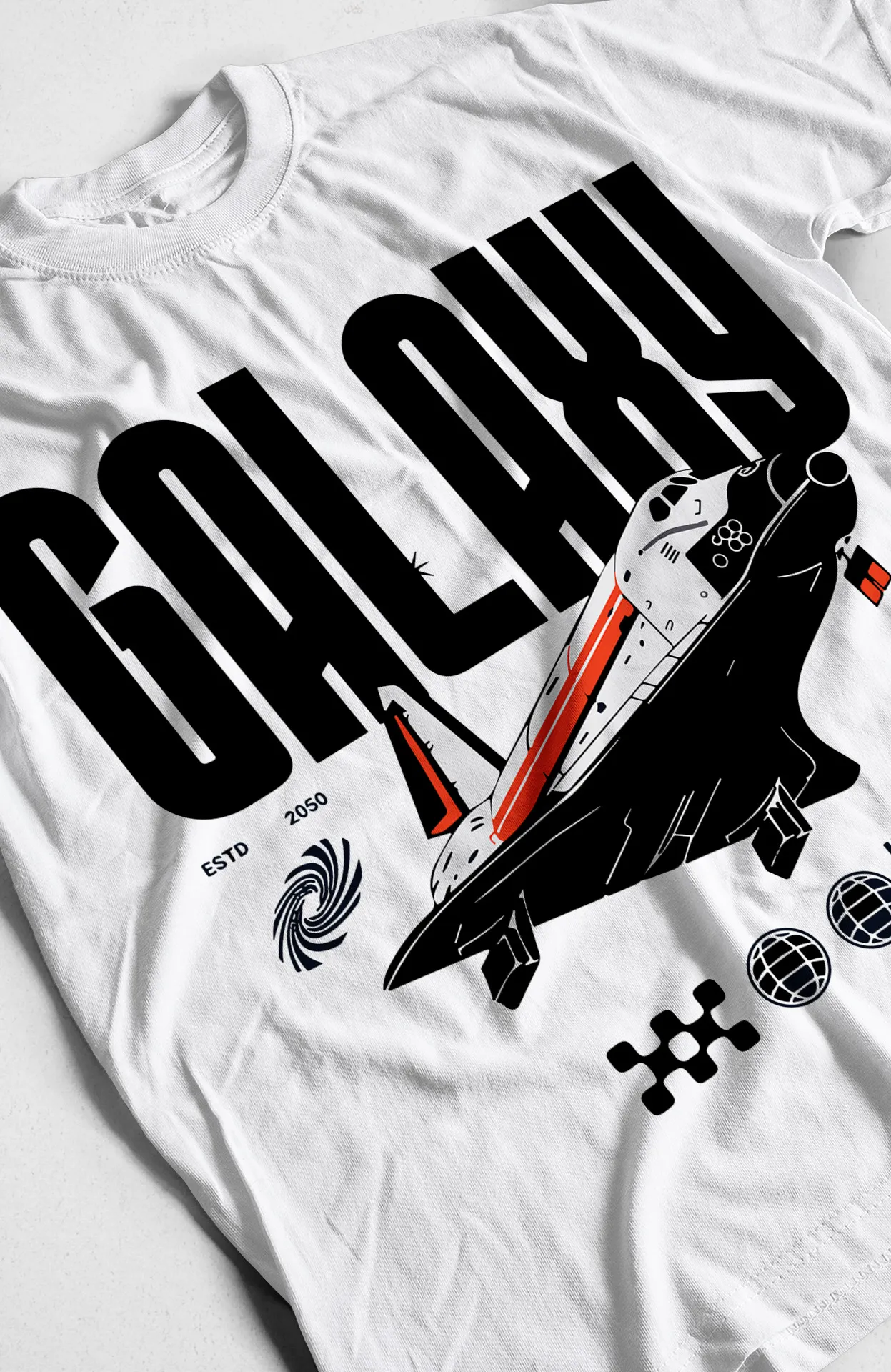 | Diseño | Gráfico de una nave espacial con texto "GALAXY" y detalles de códigos |