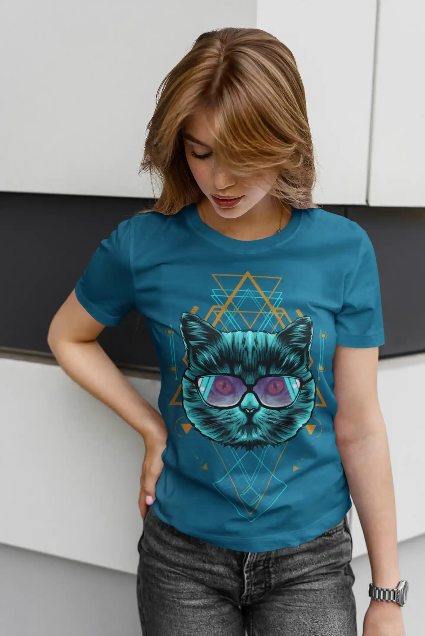 Sumérgete en un universo de estilo y misterio con nuestra camiseta de gato con gafas. Esta prenda no es una simple pieza de vestir, sino una declaración de individualidad. El diseño central, un gato de mirada profunda, se ve realzado por unas gafas de sol con un reflejo multicolor que le dan un toque futurista. El fondo, una intrincada red de patrones geométricos, añade un aire de "geometría sagrada" que simboliza armonía y conexión, haciendo de esta camiseta una pieza que va más allá de lo estético. Perfecta para quienes buscan una prenda que represente su amor por la moda, los felinos y lo místico.
