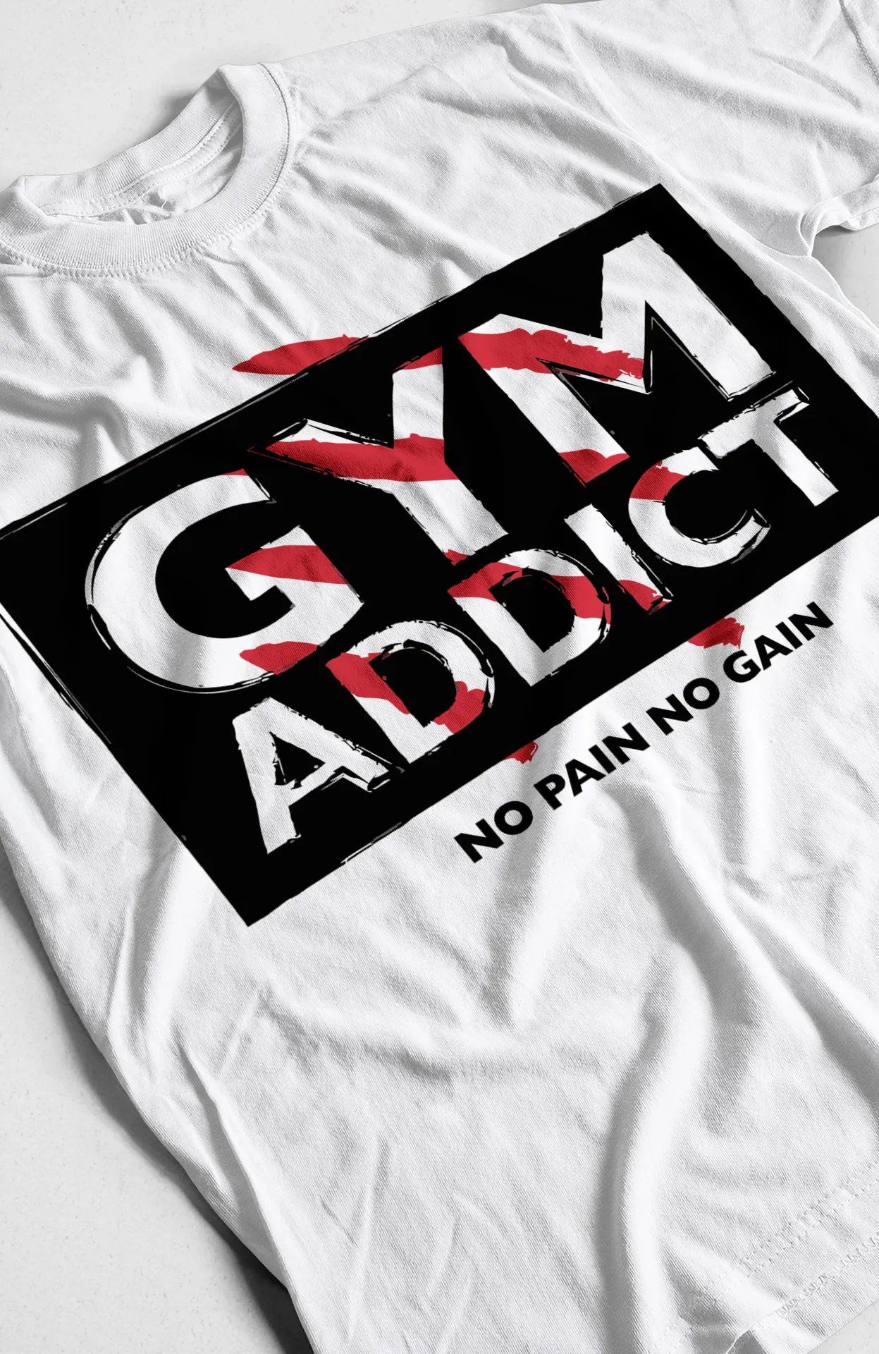 Lo que hace única a esta camiseta es la audacia de su concepto. A diferencia de los estampados comunes de deportes, este diseño tiene un carácter que combina el estilo visual con un mensaje de autenticidad y rebeldía. La superposición de las palabras "GYM ADDICT" y "NO PAIN NO GAIN" con el estilo vintage crea una narrativa visual que la convierte en una prenda distintiva que no pasará desapercibida. Es ideal para quienes buscan ropa que no solo se vea bien, sino que también refleje su personalidad única y sin complejos.