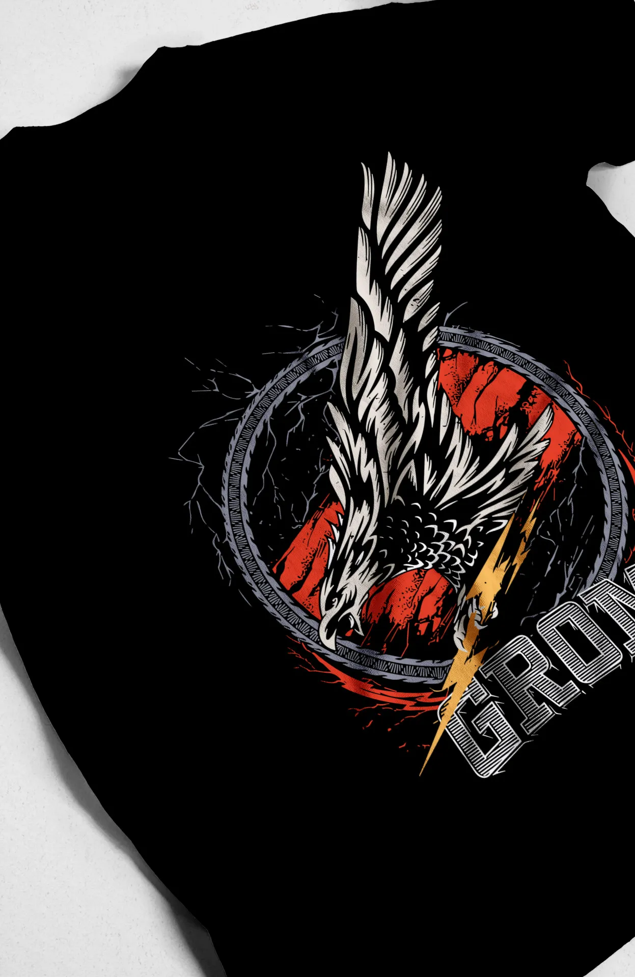 La **camiseta 'GROM'** es un lienzo de expresión personal. El diseño del ave, con sus alas extendidas y sus garras listas para el ataque, transmite una sensación de poder y dinamismo. El relámpago y el círculo con líneas irregulares le dan un toque de energía y caos controlado, característico del estilo rock. El texto 'GROM', con su tipografía desgastada, refuerza la estética alternativa de la prenda. Es la elección perfecta para quienes quieren un estilo que refleje su personalidad fuerte y su actitud desenfadada. Llévala a un concierto, a una reunión con amigos o simplemente para darle un toque diferente a tu atuendo diario. Es una pieza clave que demuestra que la moda es un juego y que no hay reglas.