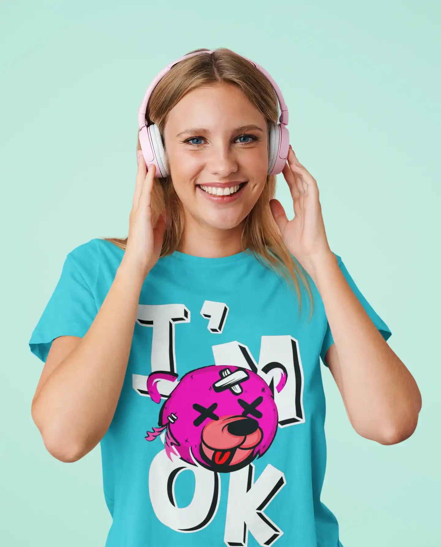 La **camiseta 'I'm OK'** es más que una simple prenda, es una pieza que cuenta una historia. El diseño del oso, con sus parches y vendajes, le da un toque de ternura y vulnerabilidad, mientras que su sonrisa y la frase 'I'm OK' transmiten una energía positiva y un gran sentido del humor. El estilo del diseño, con sus líneas gruesas y el efecto 3D del texto, le da un aire de cómic o arte urbano. Es la elección perfecta para quienes quieren un estilo que refleje su personalidad creativa y su actitud desenfadada. Llévala a un festival de música, a una reunión con amigos o simplemente para darle un toque diferente a tu atuendo diario. Es una pieza clave que demuestra que la moda es un juego y que la vida hay que tomársela con humor.