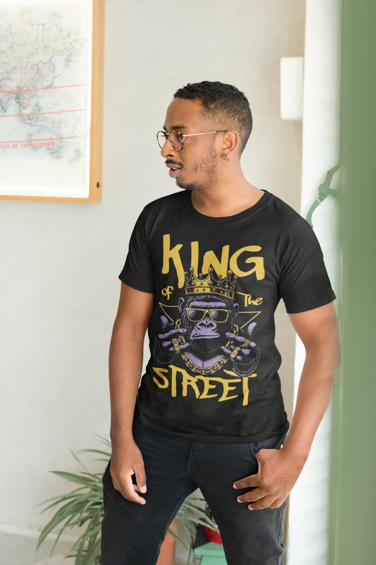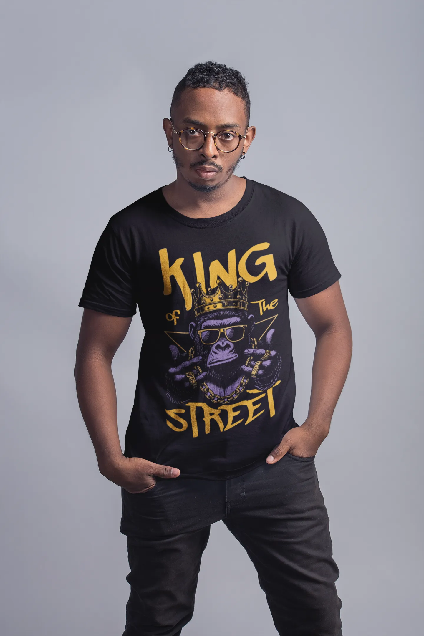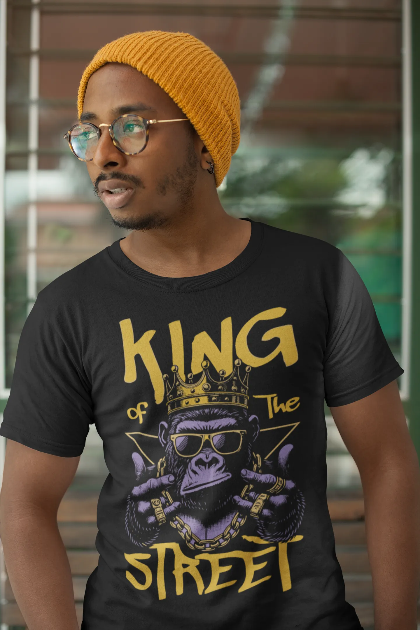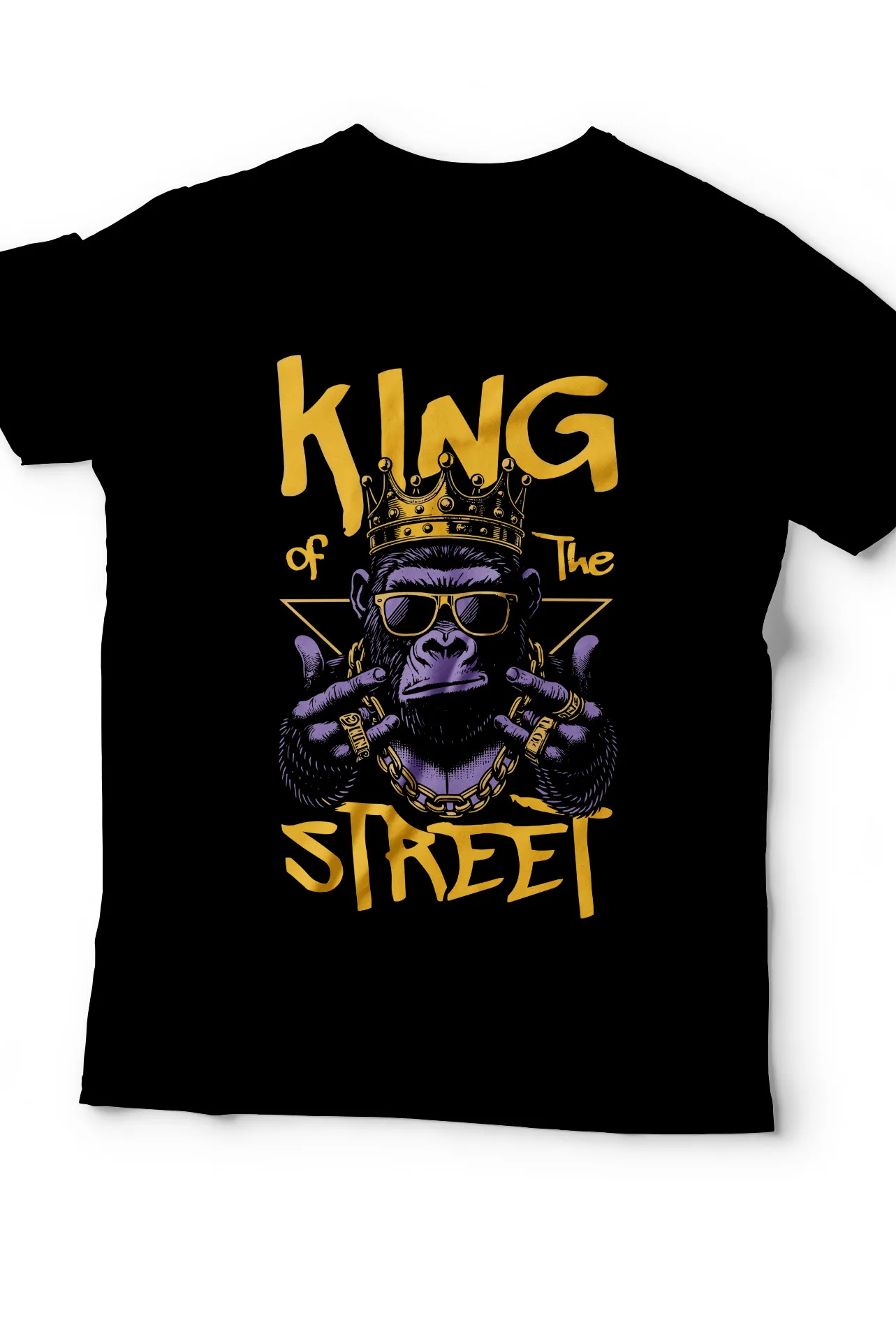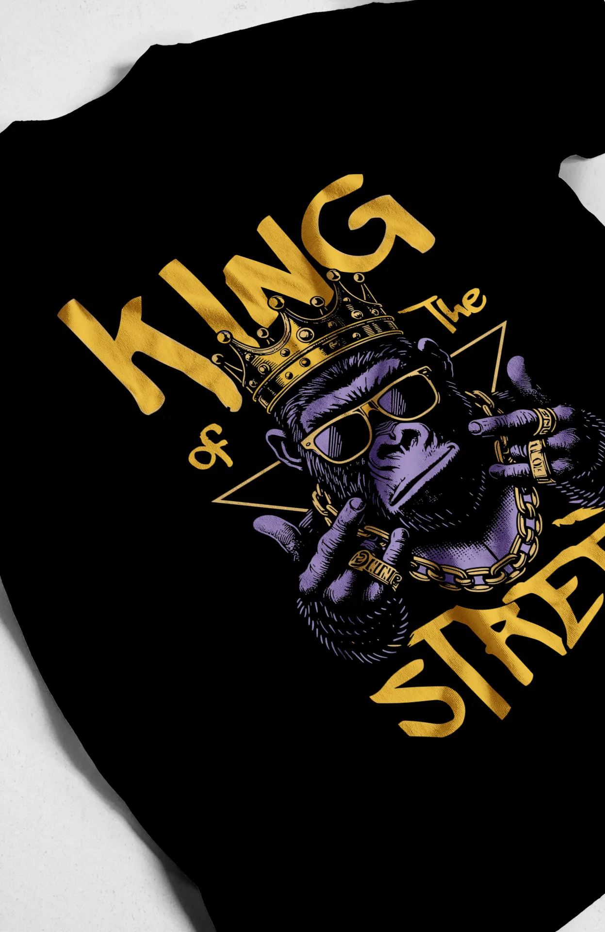 Diseño Gráfico de un gorila con gorra, gafas y corona, y texto "KING OF THE STREET"
