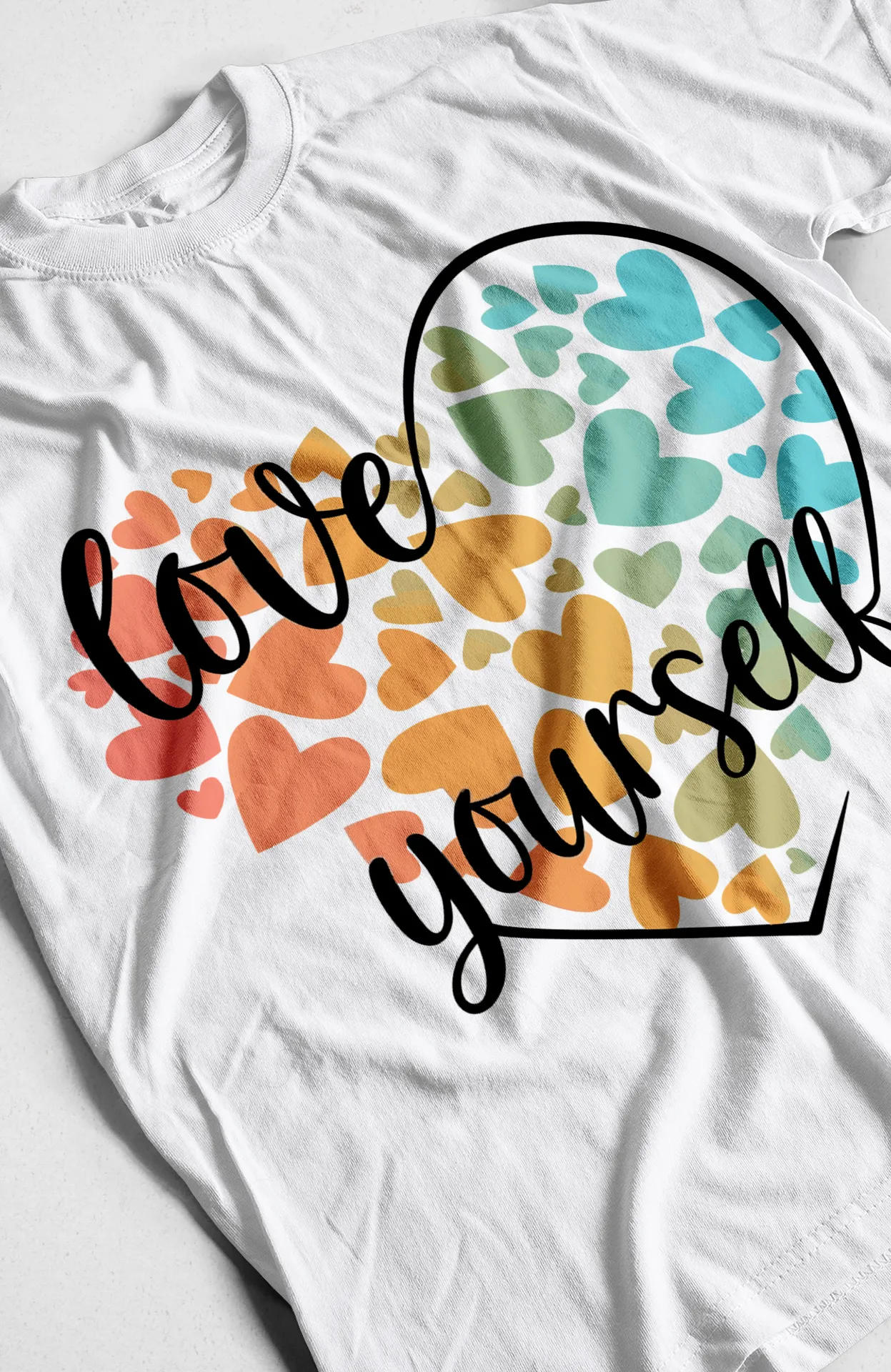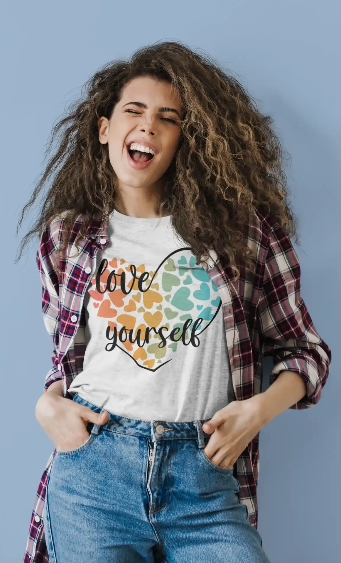 Expresa el mensaje más importante de todos: el amor propio, con nuestra camiseta "Love Yourself". Con un diseño vibrante de un corazón compuesto por pequeños corazones de colores, esta prenda es un recordatorio constante de la importancia de amarte a ti misma. Es la pieza perfecta para quienes buscan transmitir positividad y empoderamiento a través de su estilo. Úsala y siente el confort y la buena vibra que irradia.