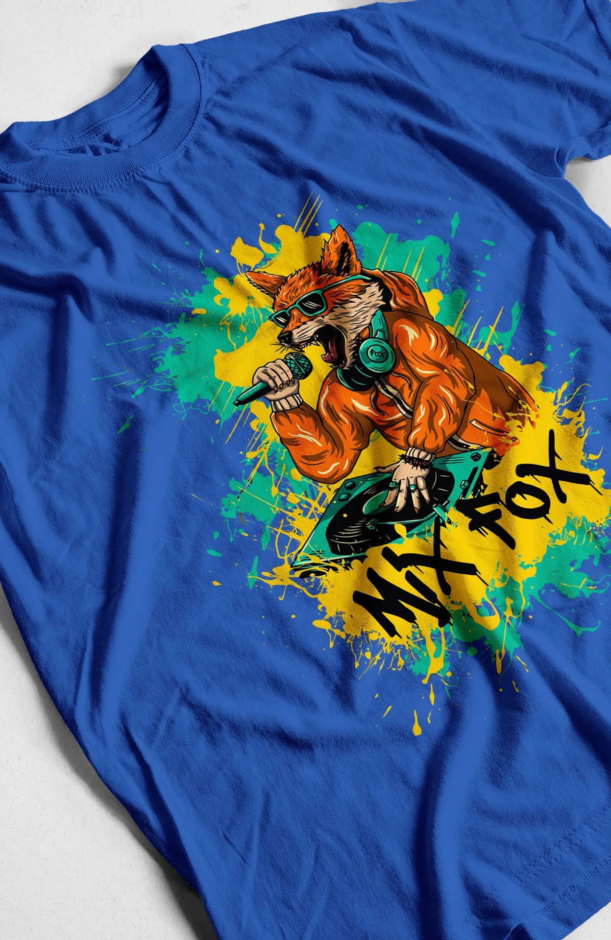 | Diseño | Gráfico de zorro DJ con fondo de salpicaduras de pintura y texto "MIX FOX" |