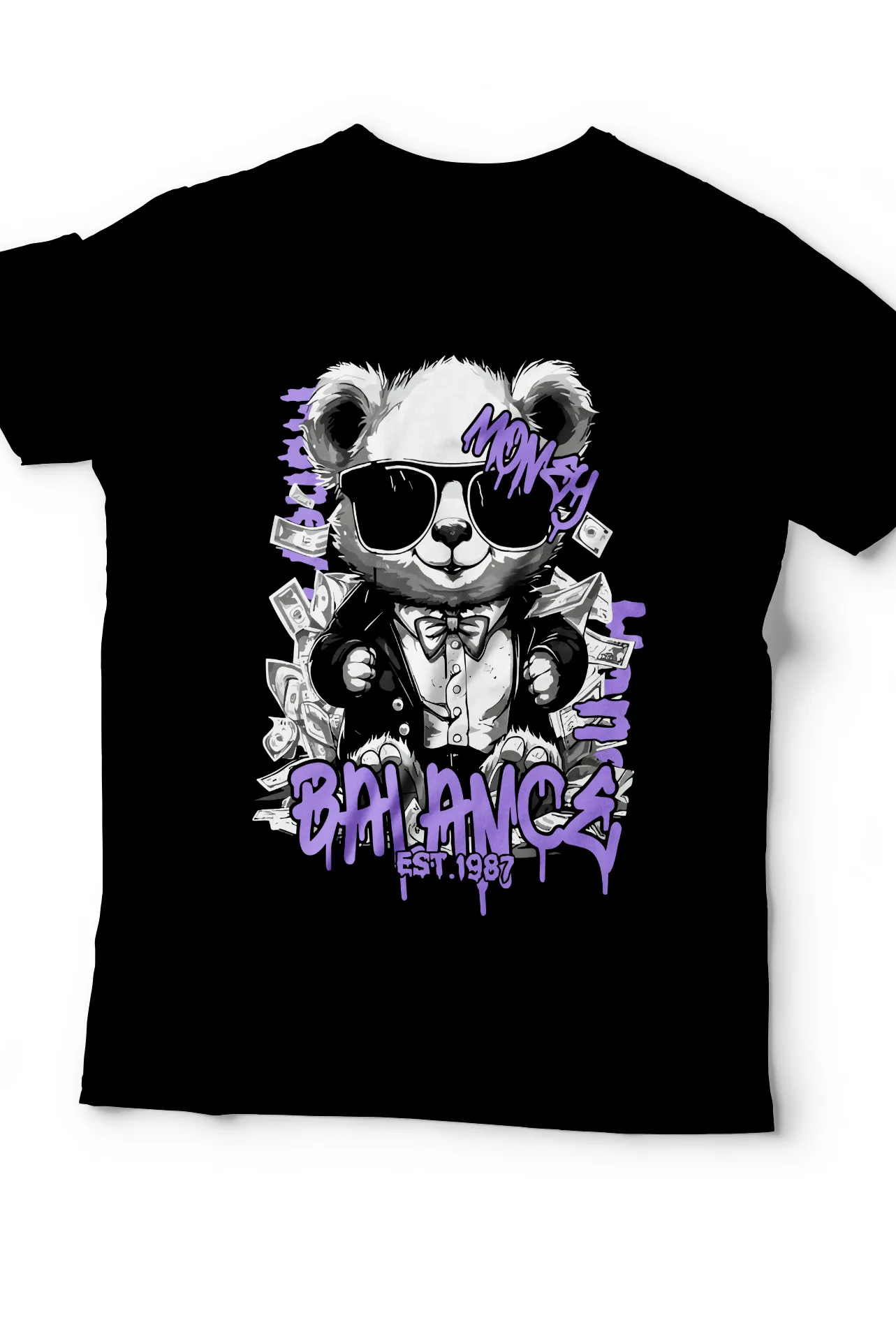 - Diseño único: La camiseta presenta a un panda con un estilo de vida audaz, rodeado de dinero, mostrando actitud y poder con el texto "Money Balance".