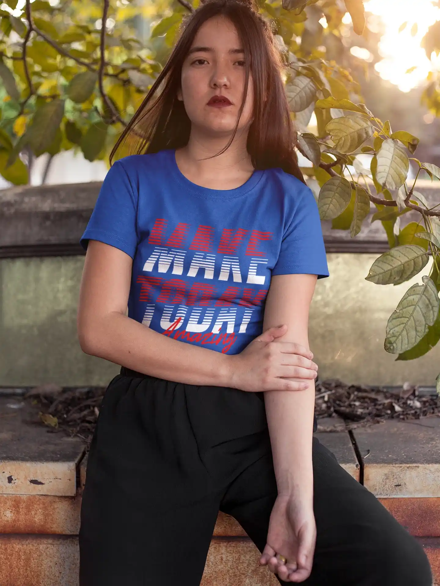 Esta camiseta presenta un diseño de cuello redondo y manga corta. El estampado central, "MAKE TODAY", utiliza una tipografía llamativa y un juego de colores para un efecto visual dinámico y moderno. Su corte se adapta a la forma del cuerpo, proporcionando un ajuste cómodo y favorecedor. Es una prenda versátil que se convertirá en un básico indispensable en tu armario.