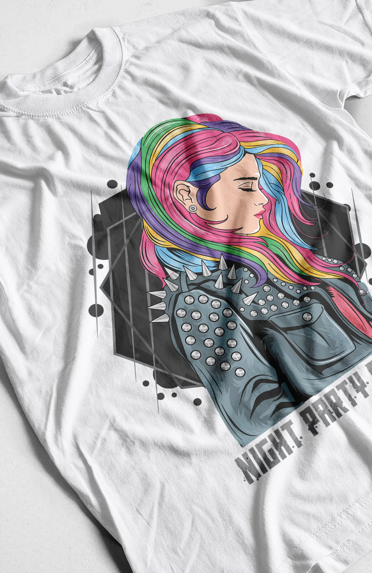 | Estampado | Gráfico en la espalda de mujer con cabello arcoíris y texto "Night Party Rocker" |