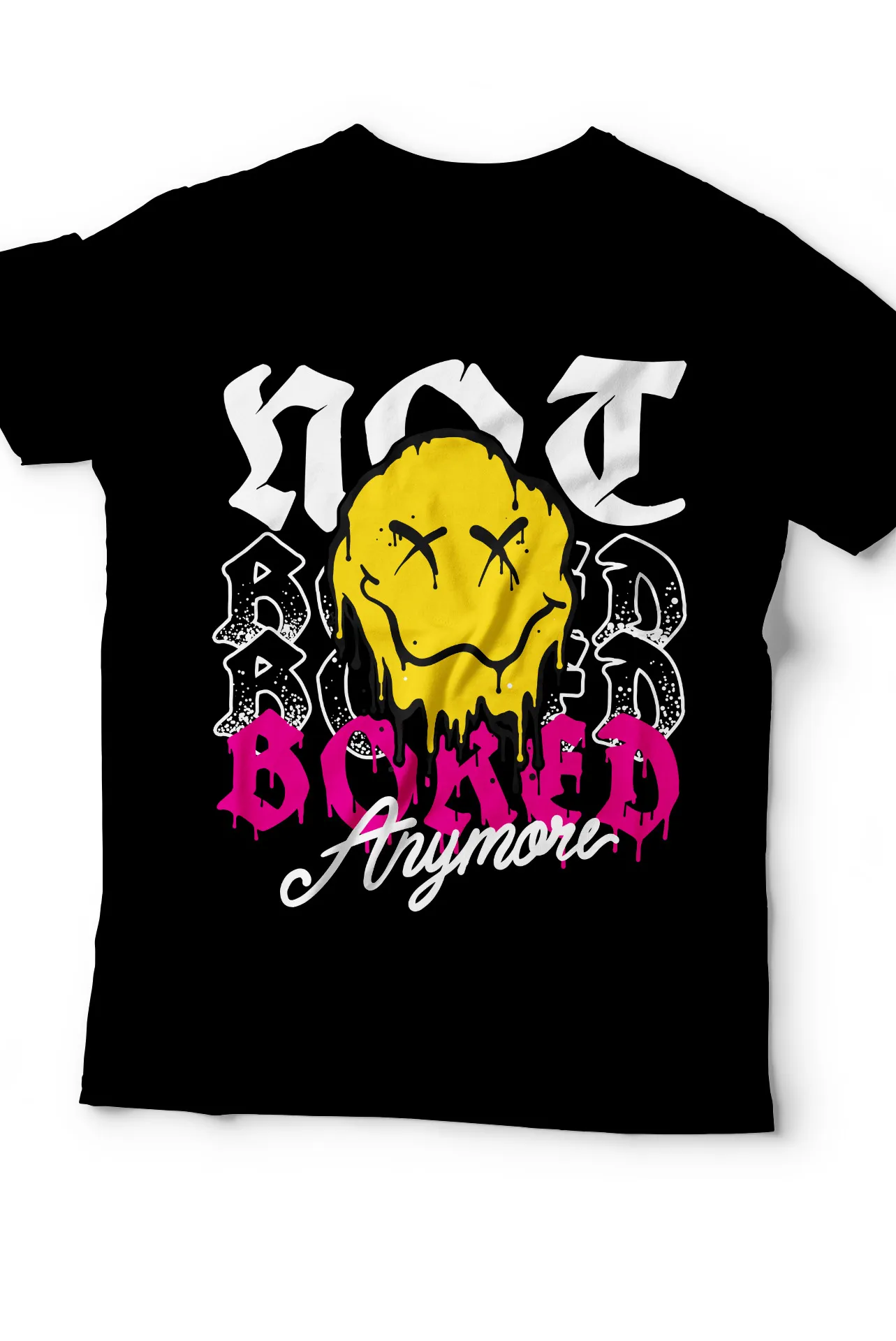 | Diseño | Gráfico de una cara sonriente derretida con texto "Not Bored Anymore" |