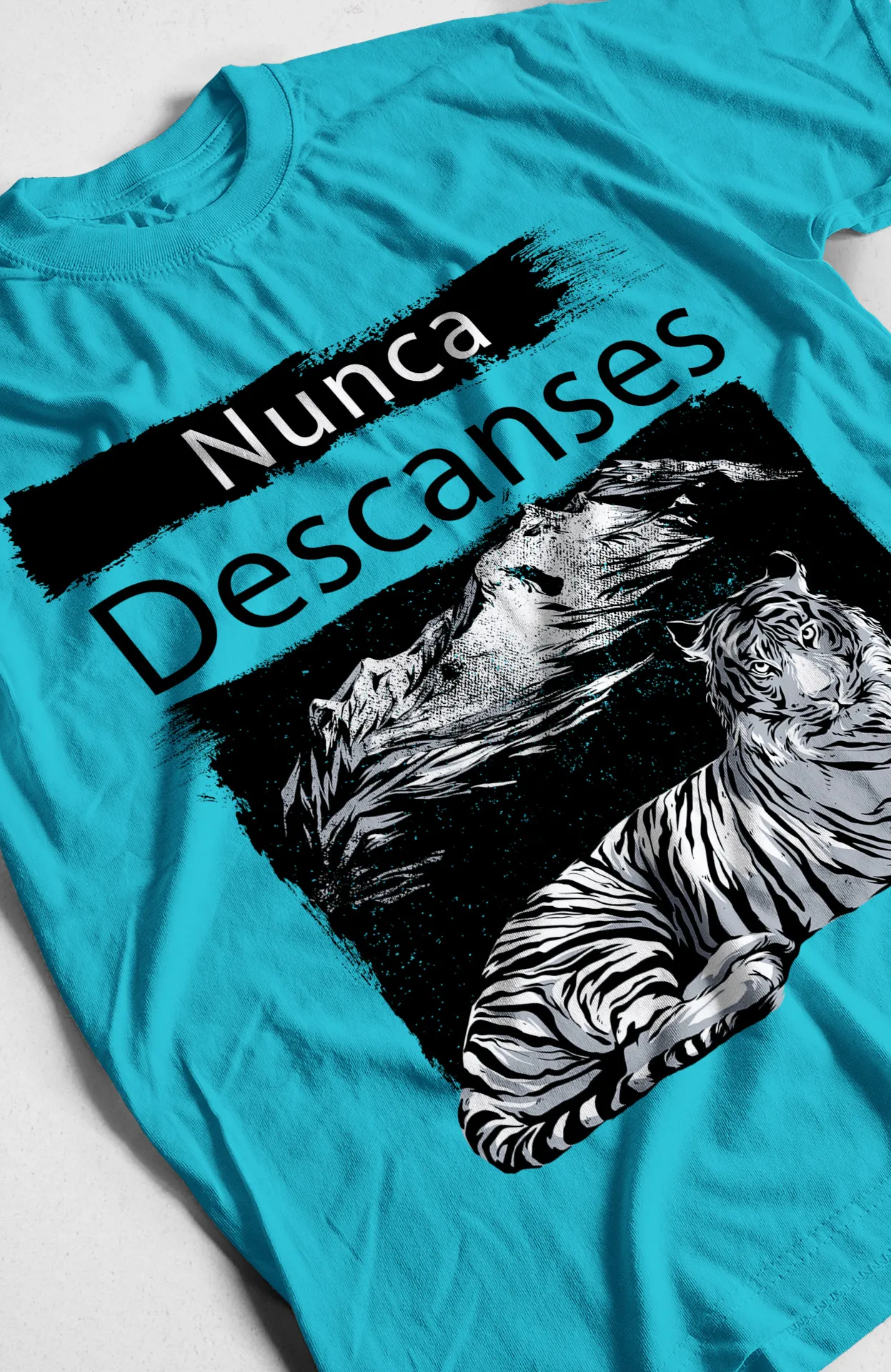 Nuestra camiseta 'Nunca Descanses' es más que una prenda, es una declaración de vida. El diseño presenta un majestuoso tigre blanco descansando, mientras que la frase que lo acompaña crea una poderosa paradoja visual. Este arte gráfico de alta calidad sobre un fondo vibrante es ideal para aquellos que buscan una moda que no solo se vea bien, sino que también tenga un significado profundo. Perfecta para el gimnasio, tu rutina diaria o para un look casual que inspire a otros.