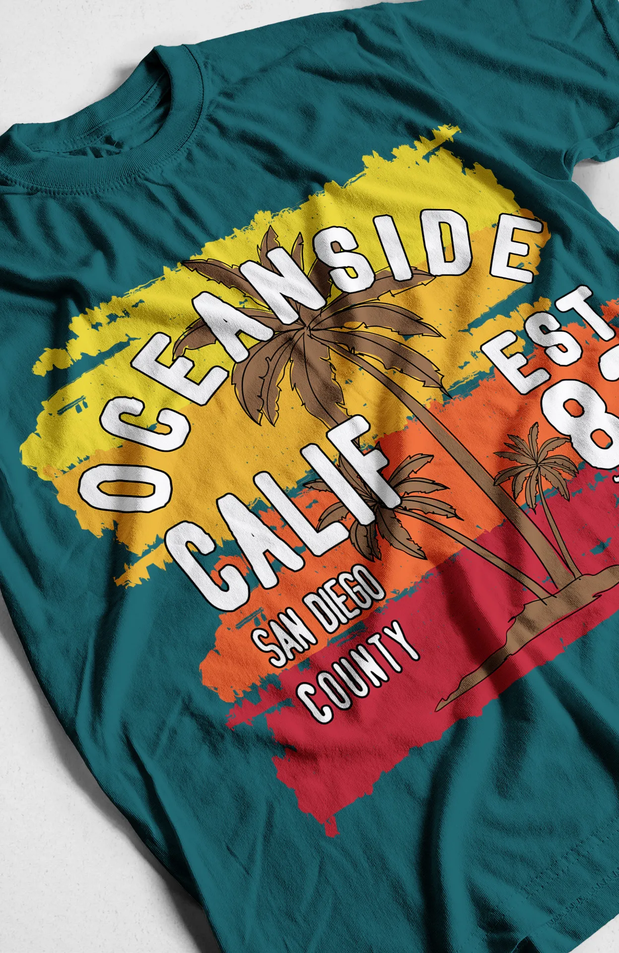 - Diseño vibrante: Inspirada en la playa de Oceanside, California, esta camiseta presenta un diseño colorido con palmeras y el icónico estilo retro de la costa oeste.