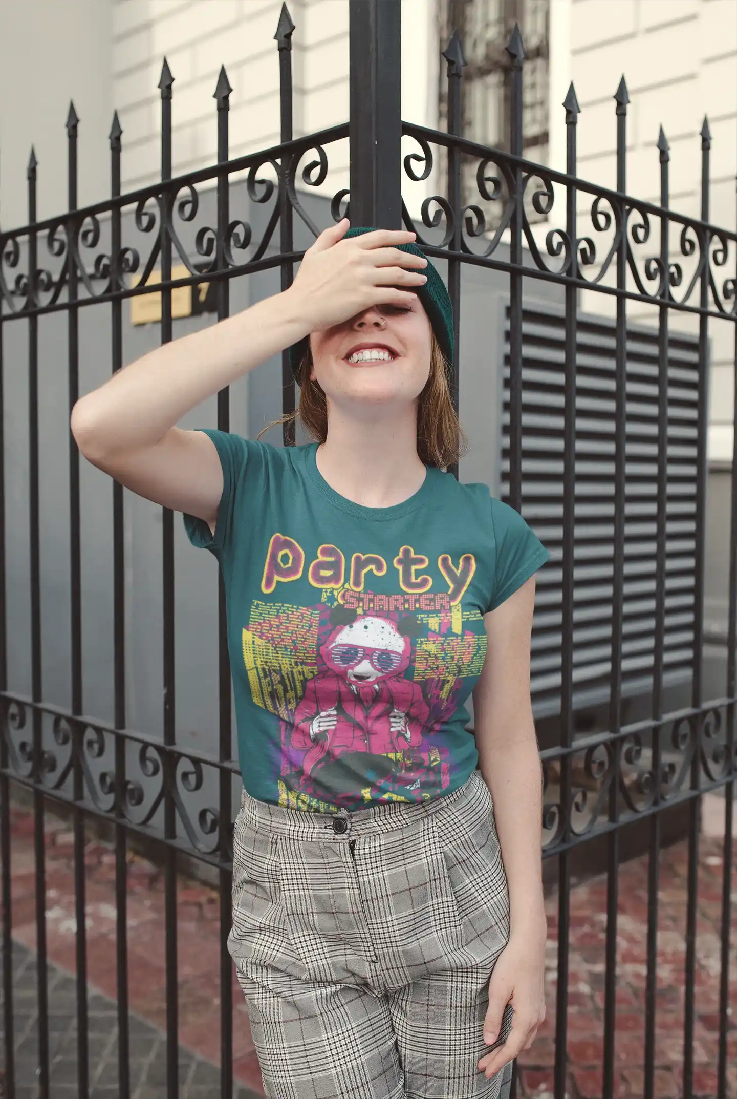 La Camiseta Party Starter es la base perfecta para un look con personalidad. Para un estilo urbano y relajado, combínala con unos pantalones a cuadros, como en la imagen, y unas zapatillas blancas. También puedes llevarla debajo de una chaqueta de mezclilla o una bomber para un toque más casual y atrevido. Es la pieza clave para construir outfits que reflejen tu lado más divertido y lleno de energía.