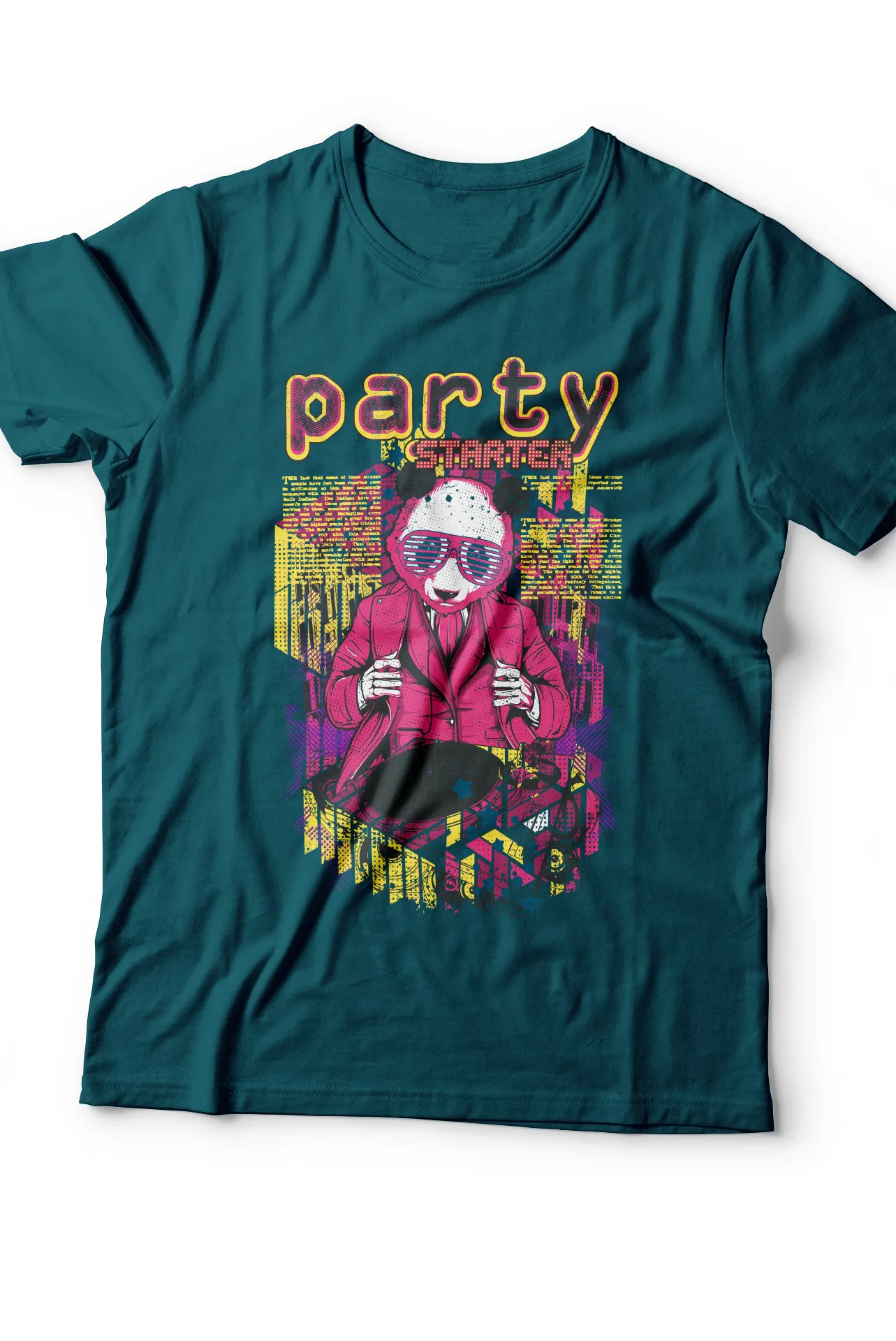 Esta camiseta presenta un vibrante color de fondo sobre el que destaca el estampado central. El diseño muestra un panda con traje y gafas de sol, acompañado de la tipografía "party starter". Los gráficos tienen un efecto de píxeles y colores neón que refuerzan su estética retro. Su confección es de cuello redondo y manga corta, proporcionando un ajuste cómodo y versátil para cualquier ocasión. El estampado es de alta calidad, asegurando durabilidad y colores vivos a lo largo del tiempo.