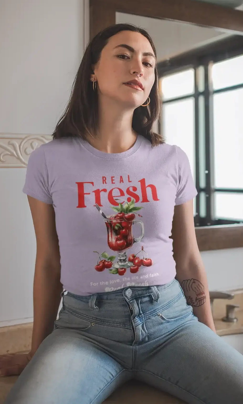 La camiseta "Real Fresh" es perfecta para un look relajado y fresco. Combínala con tus pantalones cortos favoritos para un día caluroso, o con jeans para un estilo más informal. ¡Es una prenda que te hará sentir fresca y vibrante en cualquier ocasión!