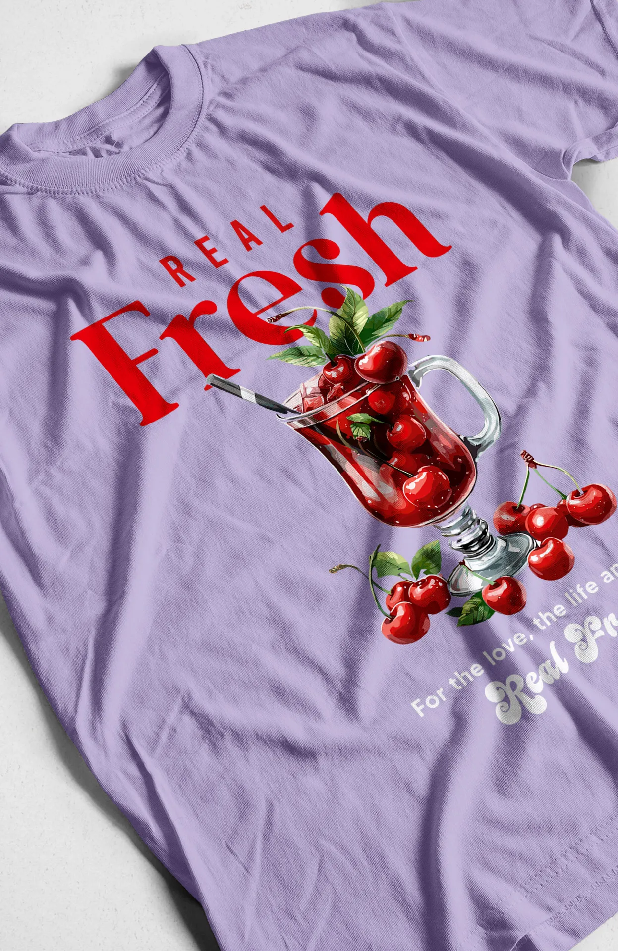 ¡Refresca tu estilo con la camiseta "Real Fresh"! Esta prenda única presenta un diseño vibrante con un vaso de jugo de cereza y el mensaje "REAL Fresh", transmitiendo una sensación de frescura y vitalidad. Ideal para los días soleados o para cualquier ocasión casual, esta camiseta es el toque perfecto para quienes buscan un estilo cómodo y alegre.