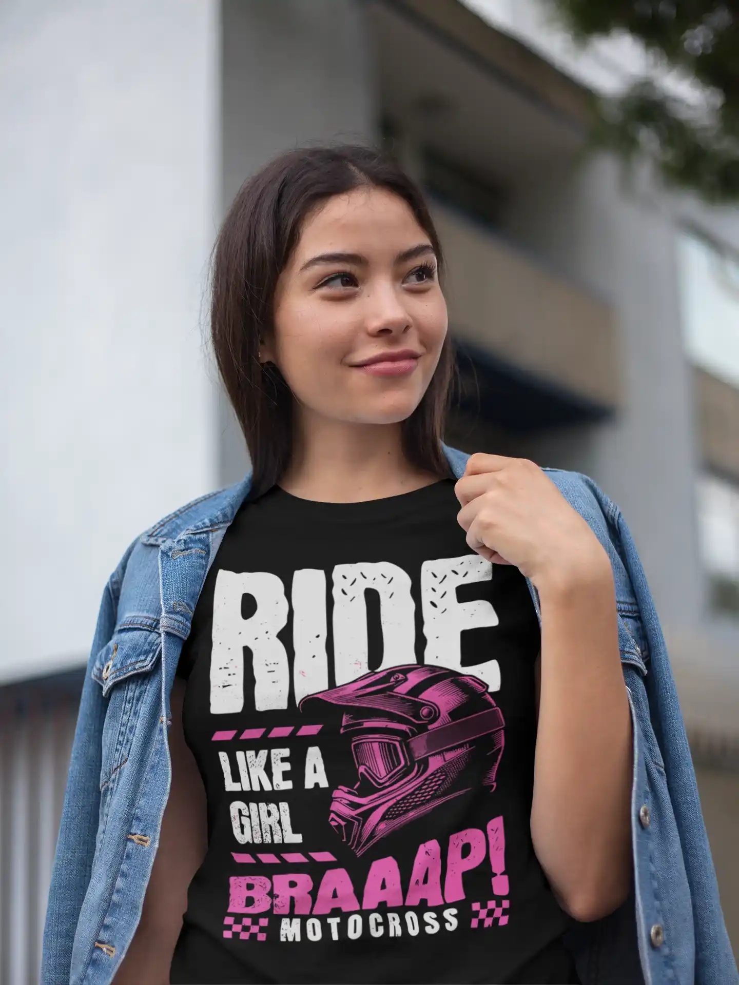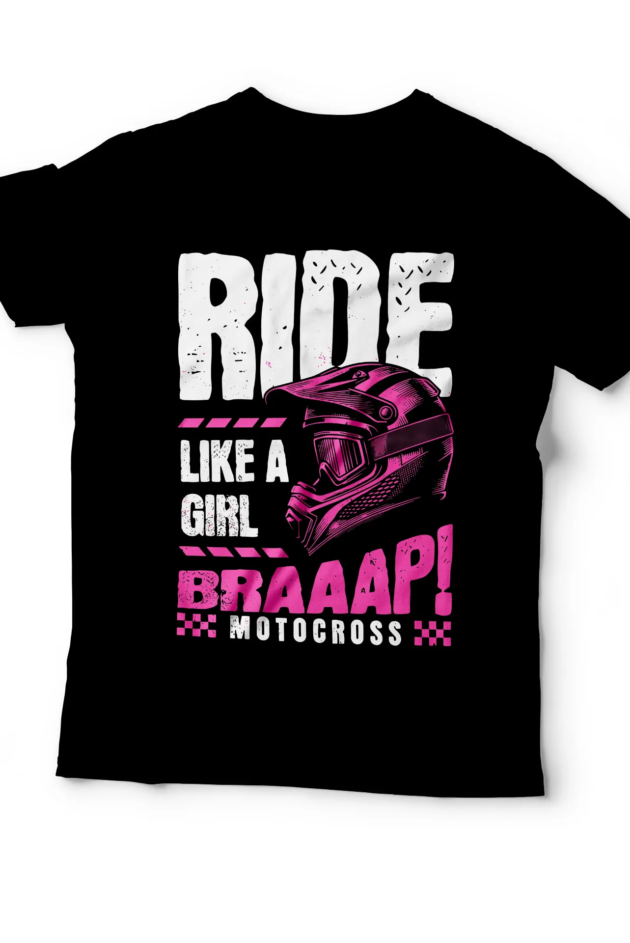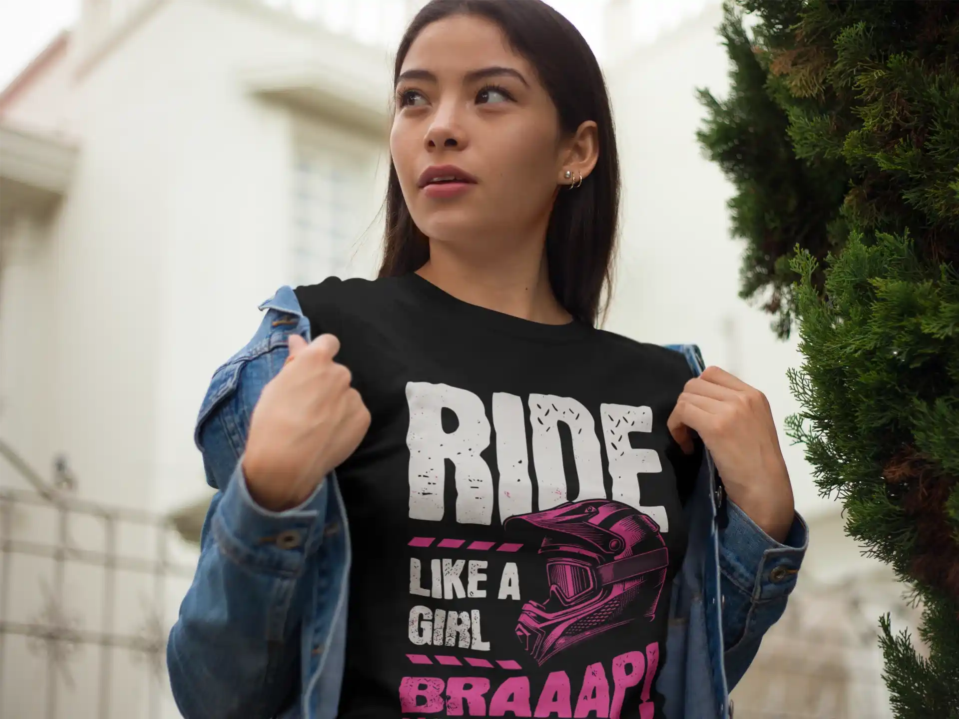 Esta camiseta no es solo una prenda, es una declaración de poder y determinación. El mensaje 'Ride Like A Girl' (Conduce como una chica), acompañado del diseño de un casco de motocross y la onomatopeya 'BRAAAP!', captura la esencia de la velocidad y el empoderamiento femenino. Es la prenda perfecta para quienes se sienten atraídas por la adrenalina y buscan una forma de expresar su pasión por el motocross. Combínala para un look que refleje tu audacia y tu amor por el motor.
