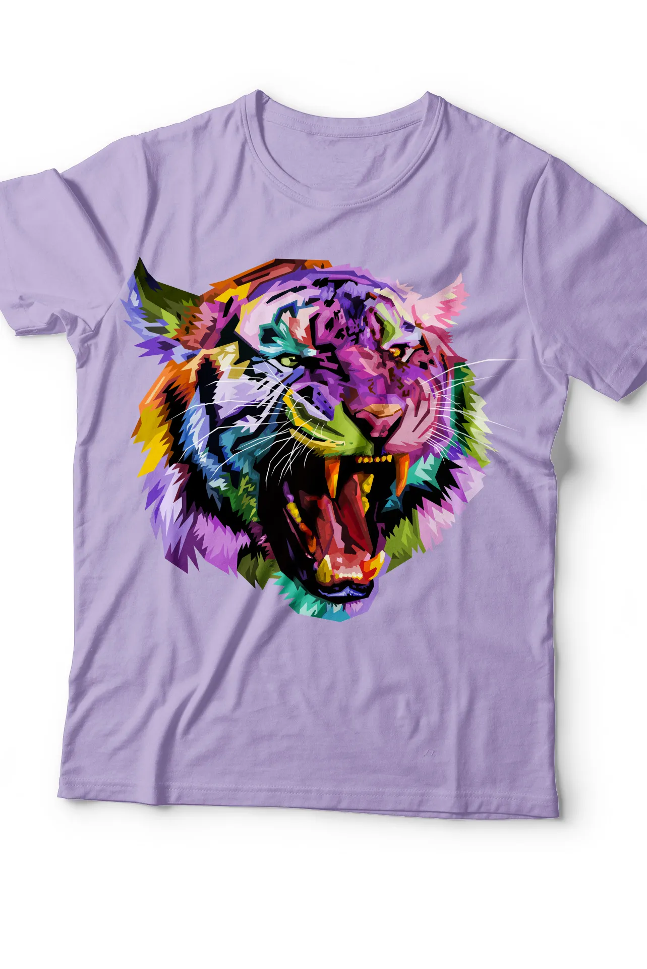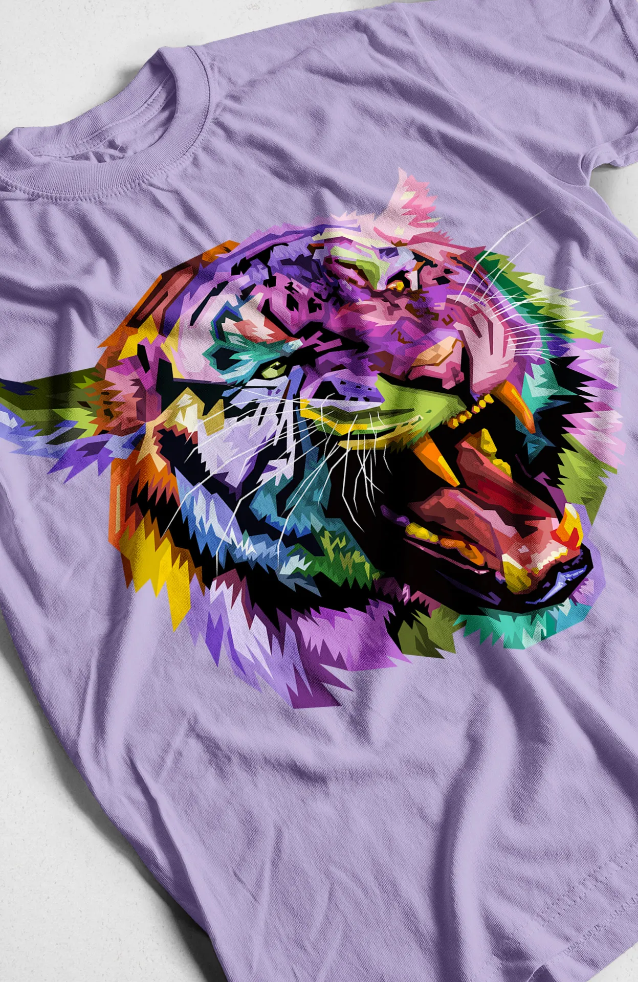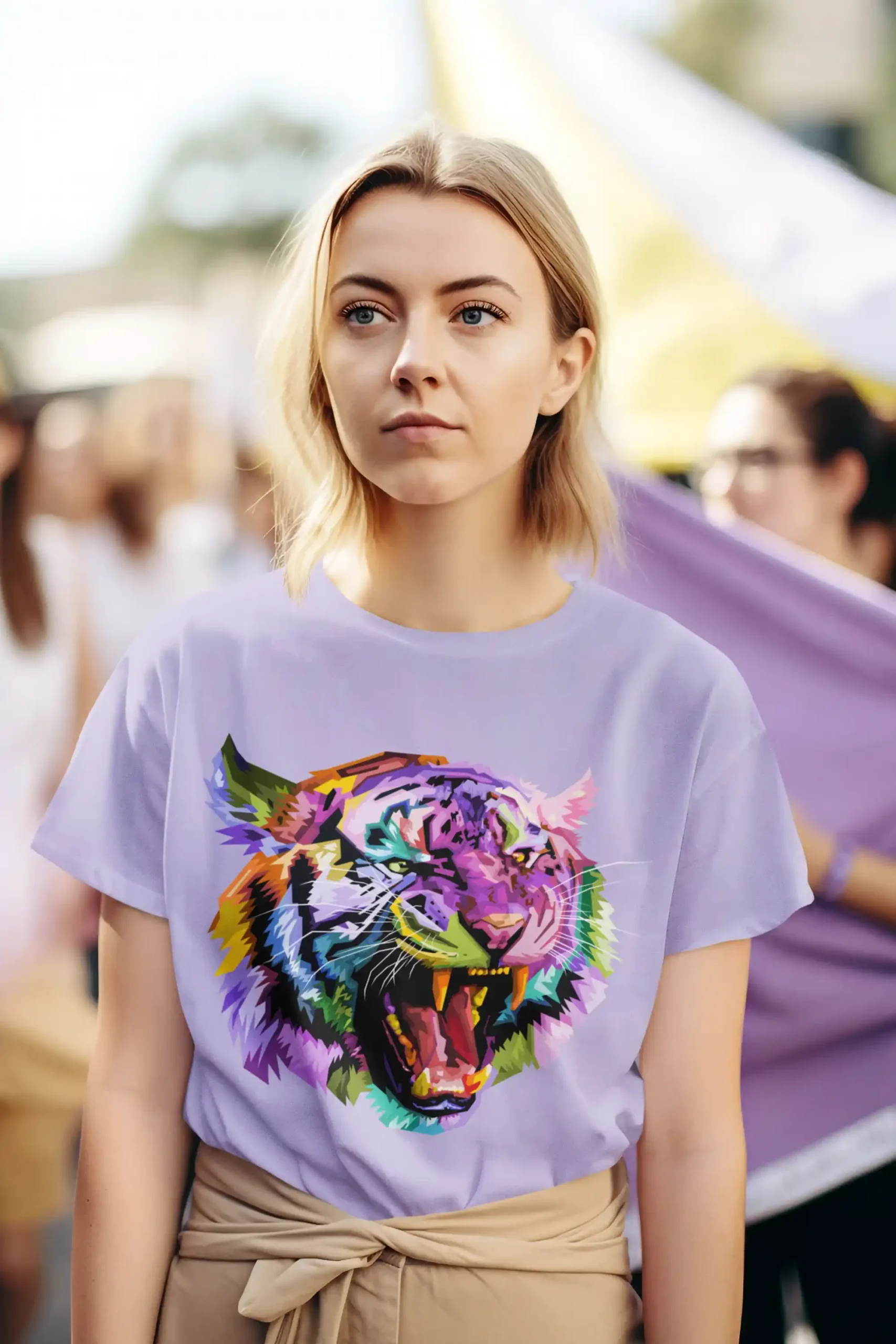 La camiseta "Rugido de Tigre" es la pieza central de cualquier outfit. Combínala con jeans desgastados y zapatillas para un look urbano y casual. Para una salida más atrevida, llévala con una chaqueta de cuero. Su diseño multicolor se presta a ser combinado con prendas de colores neutros para que el tigre sea el protagonista, o con prendas de colores complementarios para un look más atrevido.