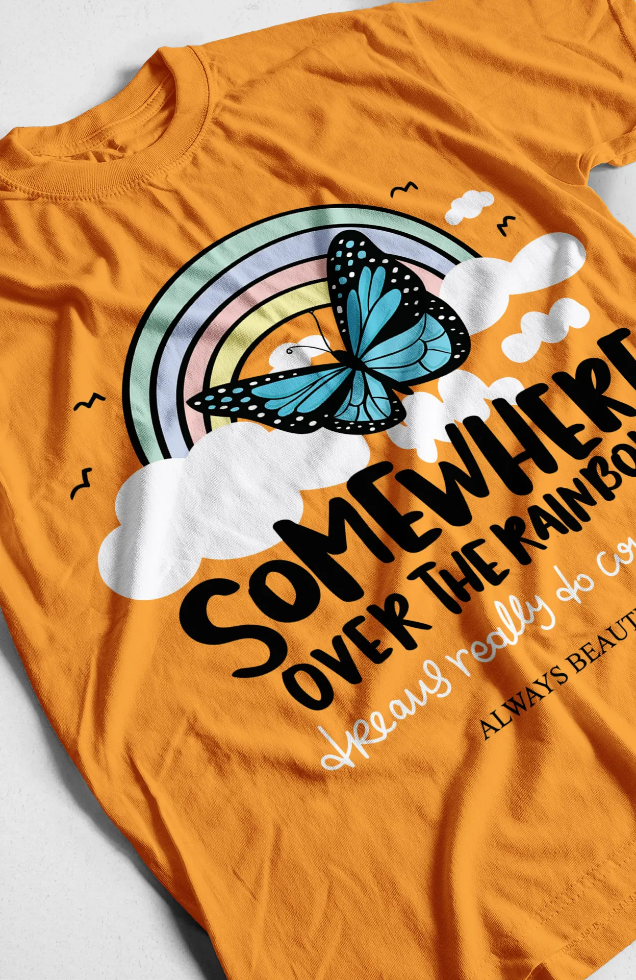La camiseta “Somewhere Over the Rainbow” es mucho más que moda: es un recordatorio constante de que los sueños realmente se hacen realidad. Con un diseño encantador de arcoíris pastel, una mariposa azul y nubes, transmite paz, optimismo y un aire de fantasía, ideal para almas soñadoras.