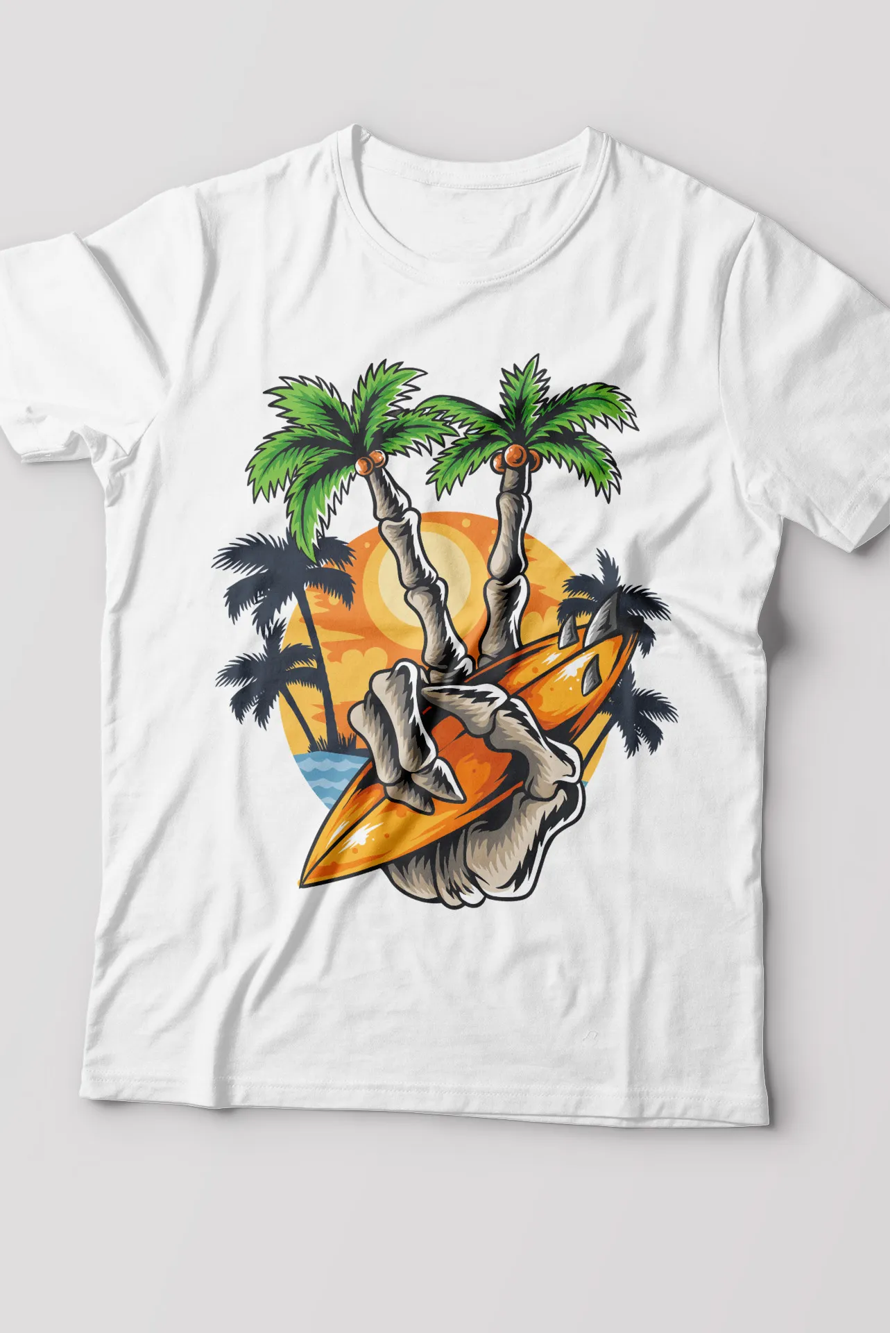 Con un diseño tropical que captura la esencia de las vacaciones, esta camiseta es ideal para quienes buscan estilo y comodidad. El gráfico de palmeras y la tabla de surf, junto al sol poniente, evoca el ambiente relajado y lleno de energía de la playa. ¡Perfecta para disfrutar del buen clima con una prenda fresca y llena de actitud!