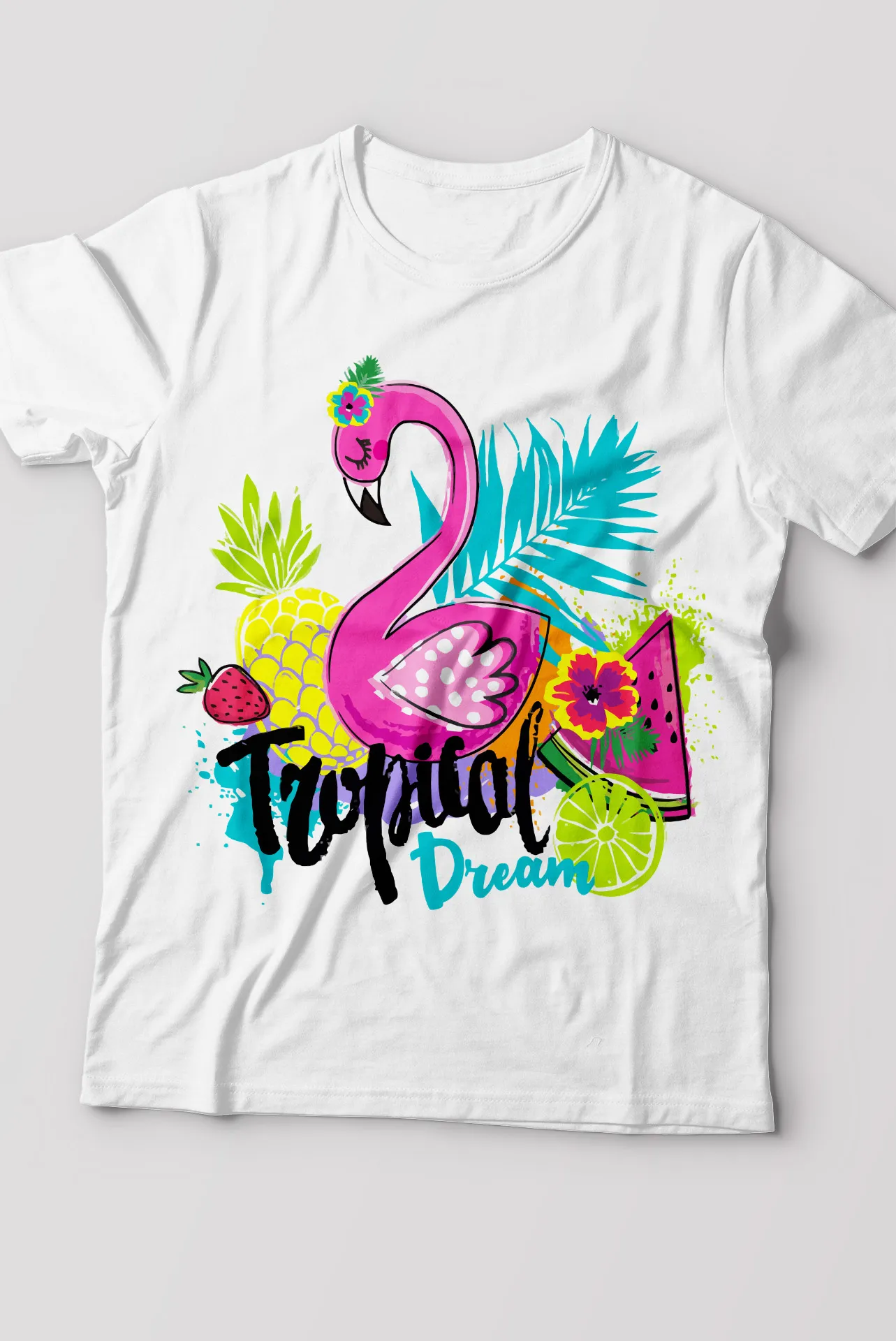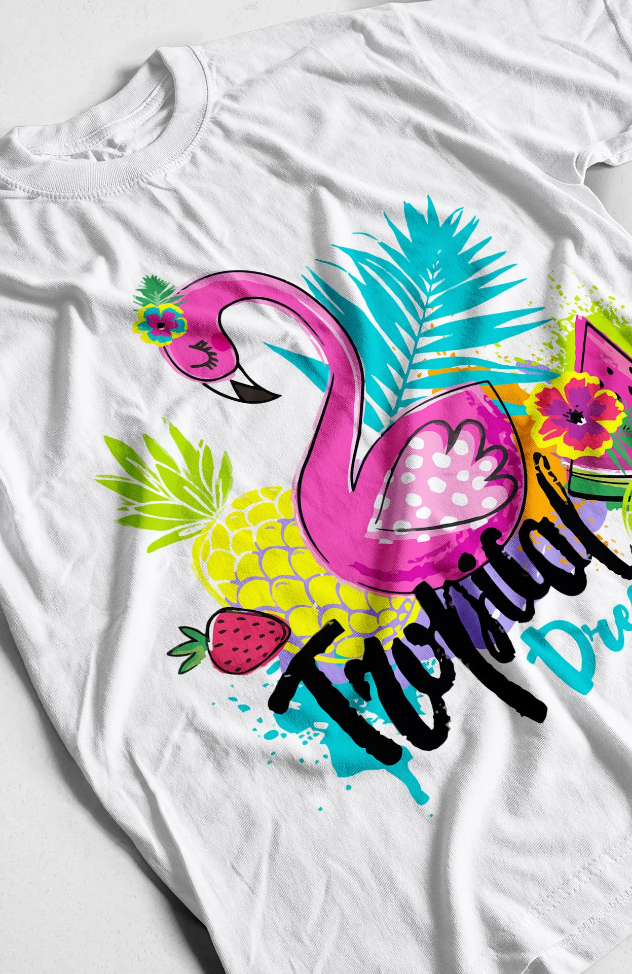 Dale un toque exótico y lleno de vida a tu guardarropa con nuestra camiseta "Tropical Dream". Inspirada en la belleza de los paisajes tropicales, esta prenda es un verdadero deleite visual. El estampado central destaca por un elegante flamenco, adornado con una flor en la cabeza, rodeado de elementos icónicos del trópico como hojas de palma, una piña y una fresa. El texto "Tropical Dream" en una tipografía fluida y divertida completa el diseño, invitándote a soñar con playas de arena y brisas cálidas. Perfecta para quienes buscan una prenda que no solo sea cómoda, sino que también refleje una personalidad vibrante y optimista.