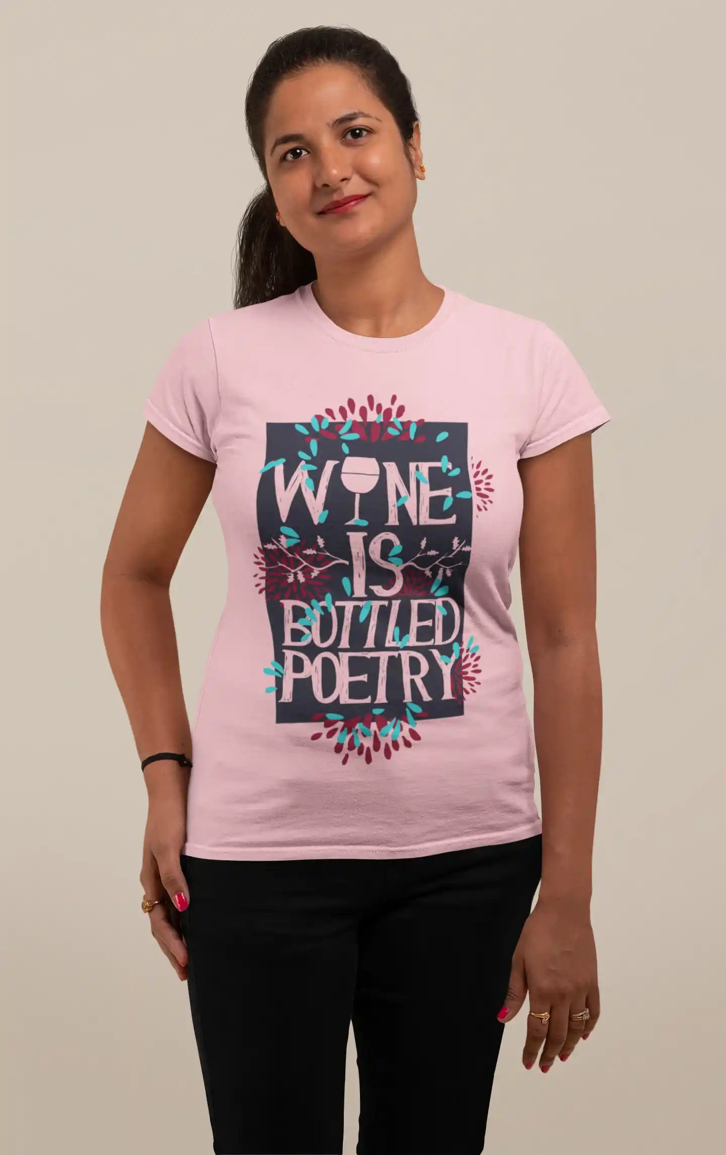 - Estilo único: Un diseño vibrante con la frase "Wine is Bottled Poetry" acompañada de ilustraciones florales y una copa de vino, ideal para quienes encuentran poesía en un buen vino.