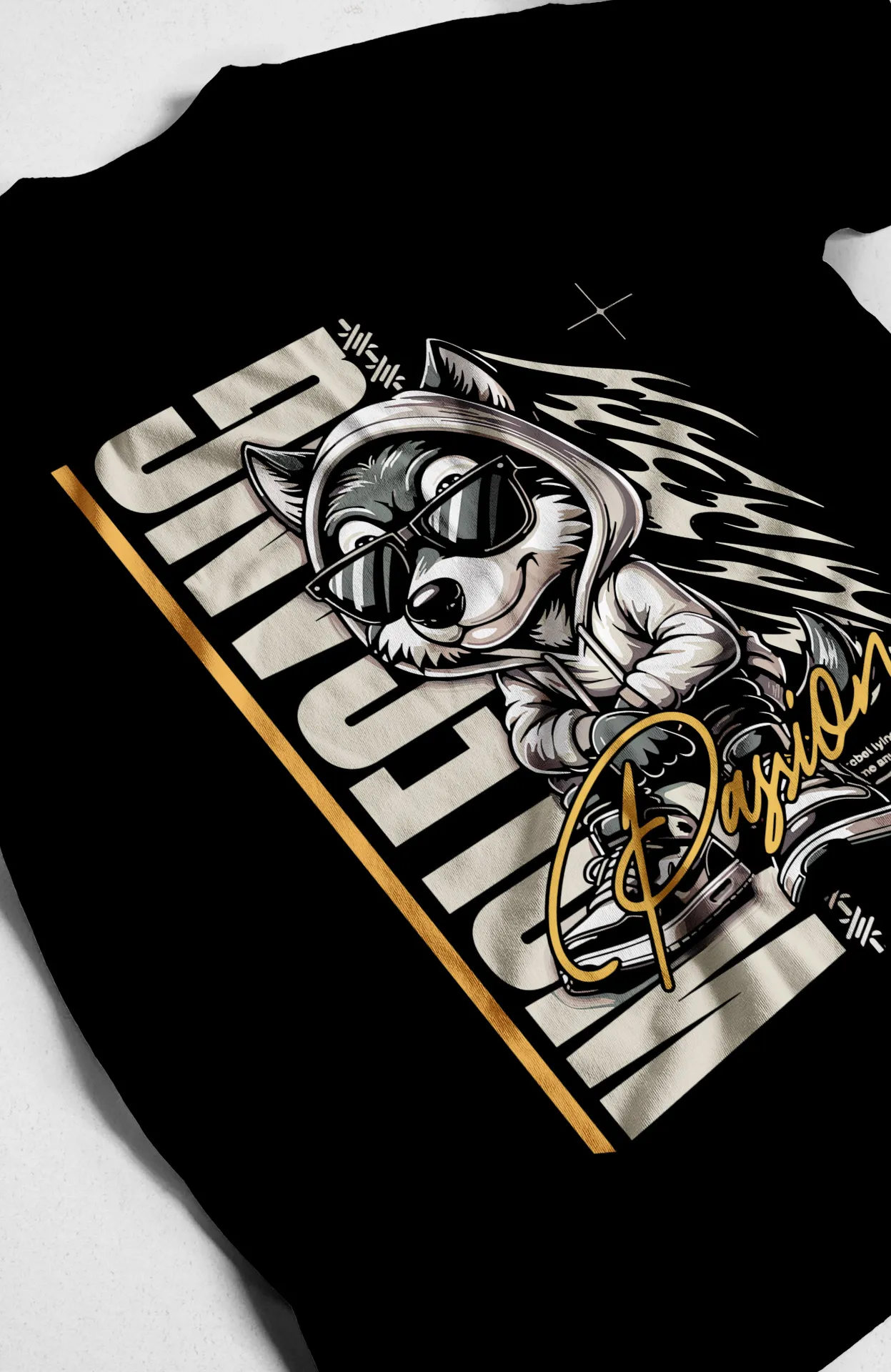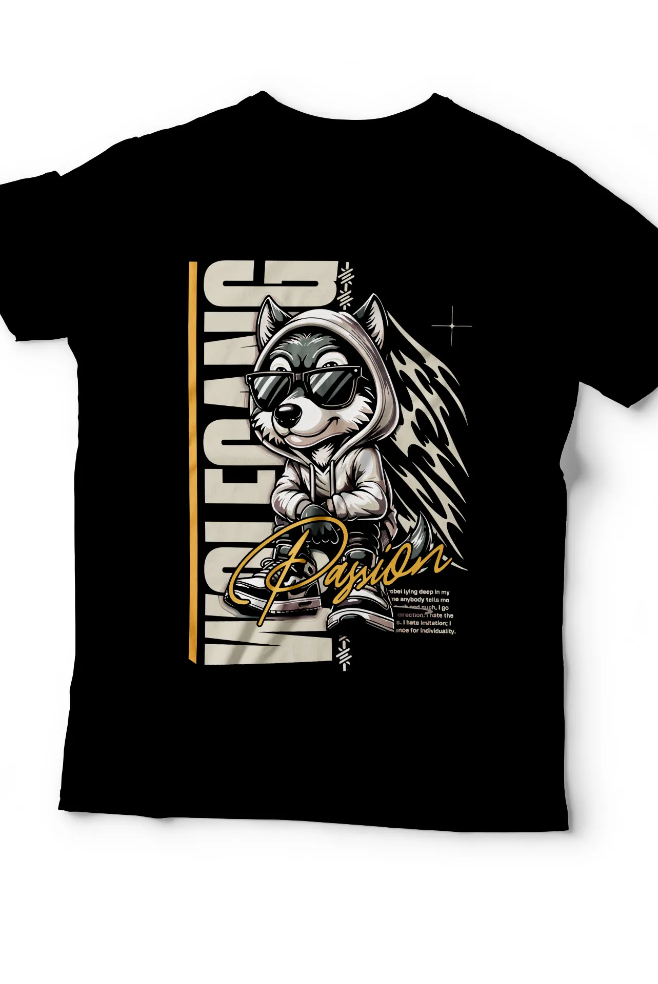 | Diseño | Gráfico de un lobo con gafas y ropa con texto "WOLF GANG" |