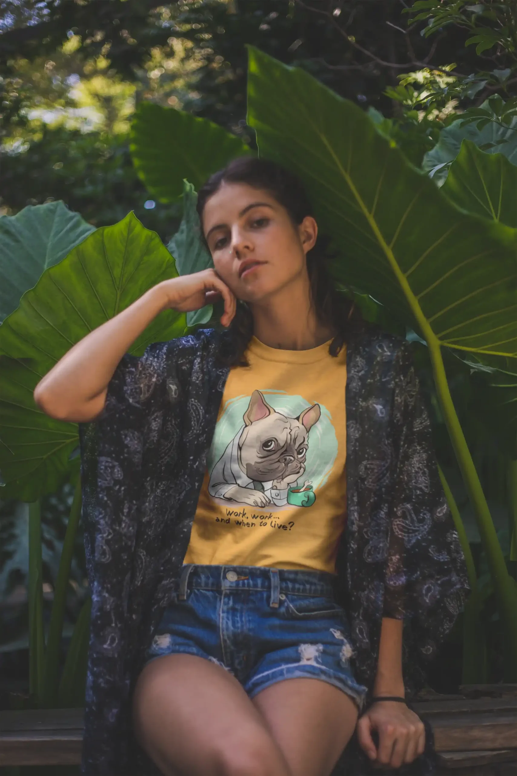 La **camiseta 'Work Work'** es más que una simple prenda. Es una forma de expresar tu personalidad de una manera divertida y sutil. El diseño gráfico, con un bulldog francés de aspecto serio frente a su laptop, está lleno de detalles que te harán sonreír. El contraste entre el animal y la actividad humana crea un efecto visual único y memorable. Perfecta para quienes trabajan duro, pero no se olvidan de vivir, esta camiseta se convertirá en un básico imprescindible en tu guardarropa. Úsala en tu día a día o regálala a ese amigo que siempre está conectado, pero que también sabe relajarse. Es la mezcla perfecta entre funcionalidad y estilo.