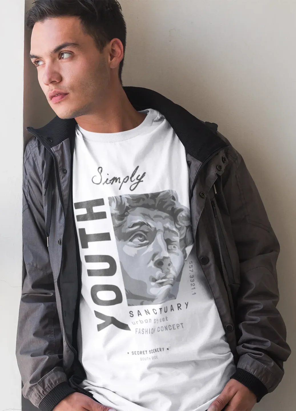 | Diseño | Gráfico de una escultura clásica con texto "Youth" y fondo minimalista |