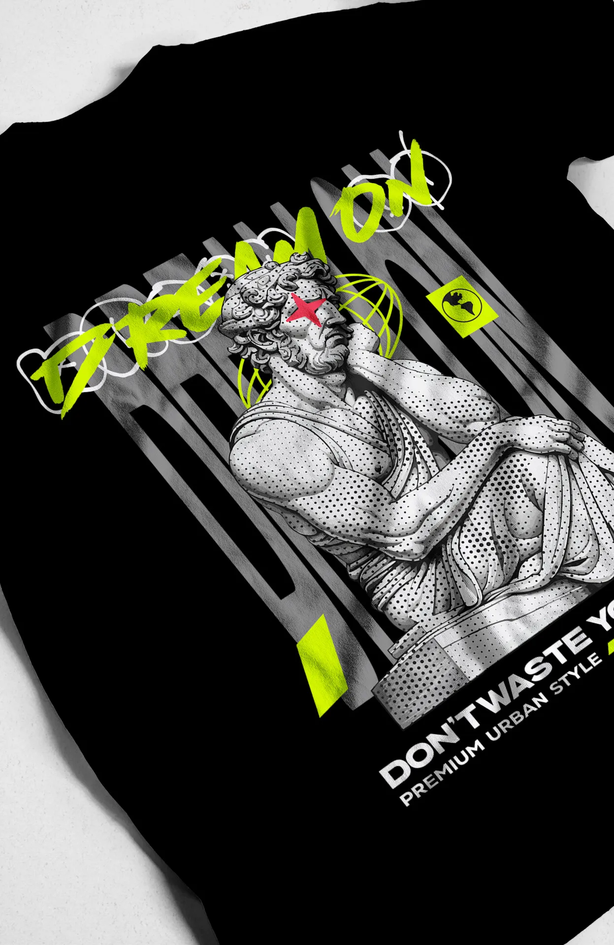 El oversize Escultura "Don't Waste Your Time" es una declaración de estilo que no pasa desapercibida. Su diseño único y lleno de carácter presenta a una figura de la mitología griega, con un estilo audaz y dinámico. Con los textos "DON'T WASTE YOUR TIME" que refuerzan su esencia, esta prenda no es solo un oversize; es un símbolo de fuerza, valentía y libertad. Es ideal para aquellos que no temen mostrar su espíritu audaz y su personalidad dominante. Una pieza que combina estilo, actitud y un mensaje de poder, creando un look que es tan único como su portador.